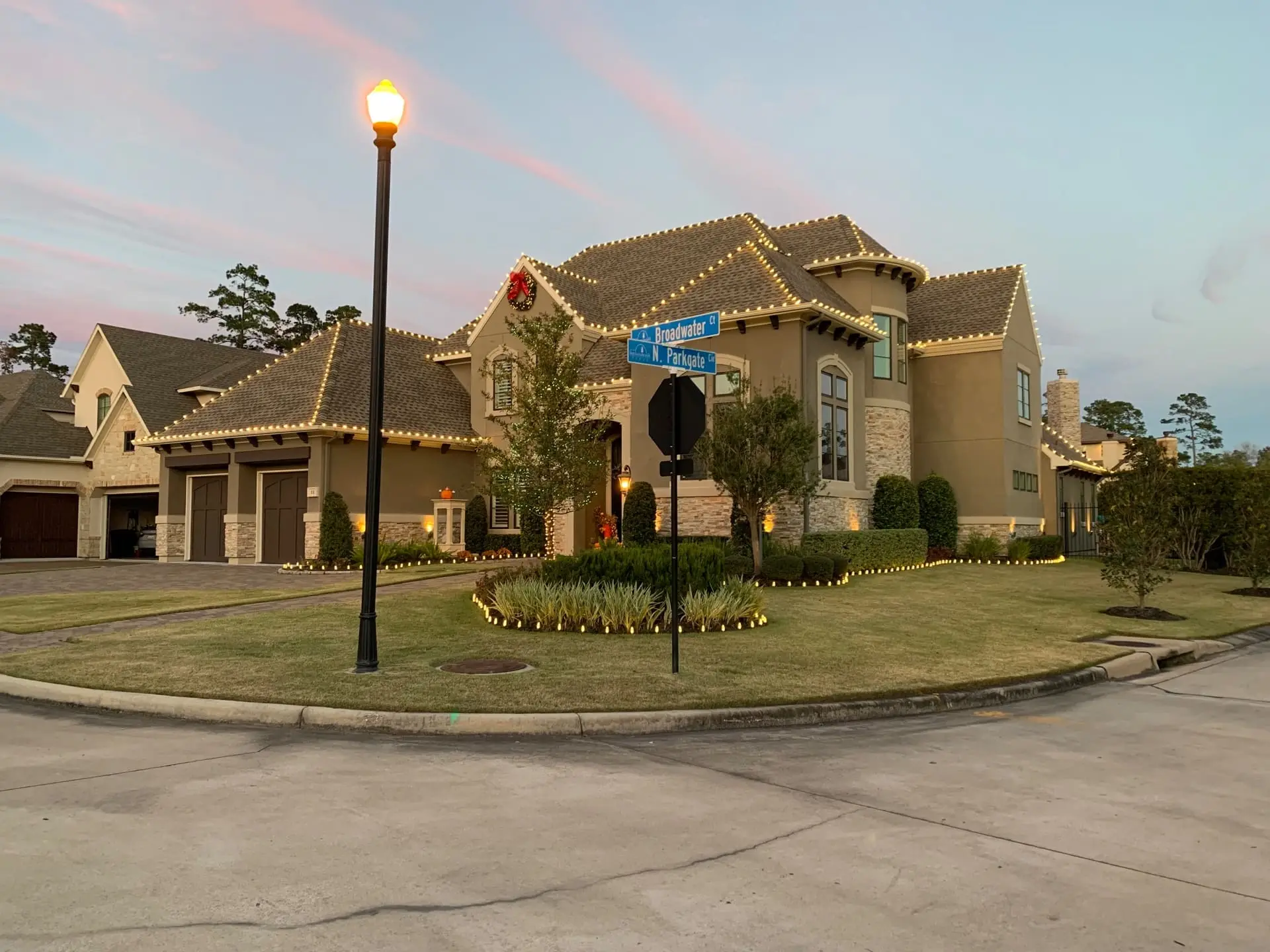 View all holiday photos →Holiday lighting covers Central Houston and the northern corridor. Spring Branch, Bunker Hill Village, The Woodlands, Spring, Klein, Cypress, Tomball, Humble, Atascocita, Kingwood, and Summerwood. Our seasonal zone is tighter than the year-round service area for our other services, so send us your address if you're unsure and we'll confirm coverage.