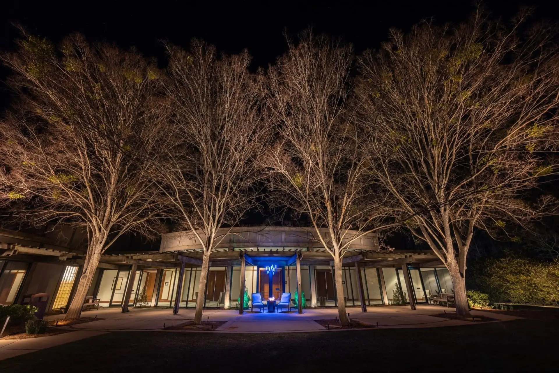 The design starts with a walk-through, in person. Which trees have character worth revealing, how the architecture reads from the street, where shadow could serve. After install, we come back at dusk to aim every fixture by eye. That's the part of the process that requires darkness.